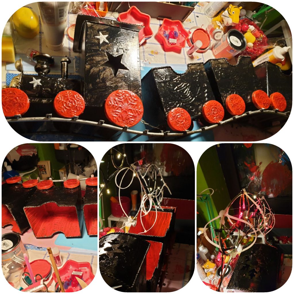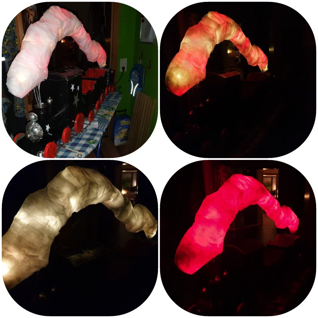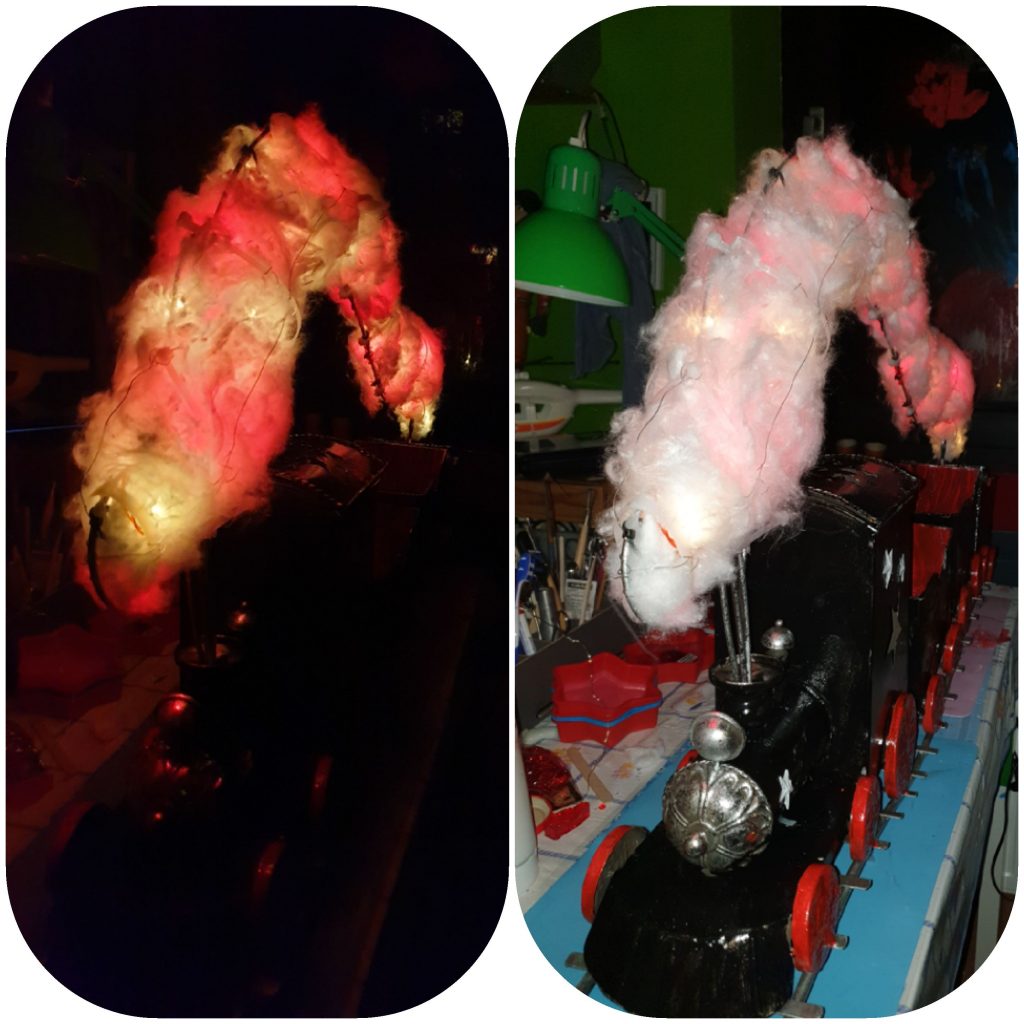 Zwischen die Kabelbinder kam Watte und zwei verschiedene Lichterketten. So kann der Polarexpress in Rot oder weiß oder Rot und weiß leuchten lassen.